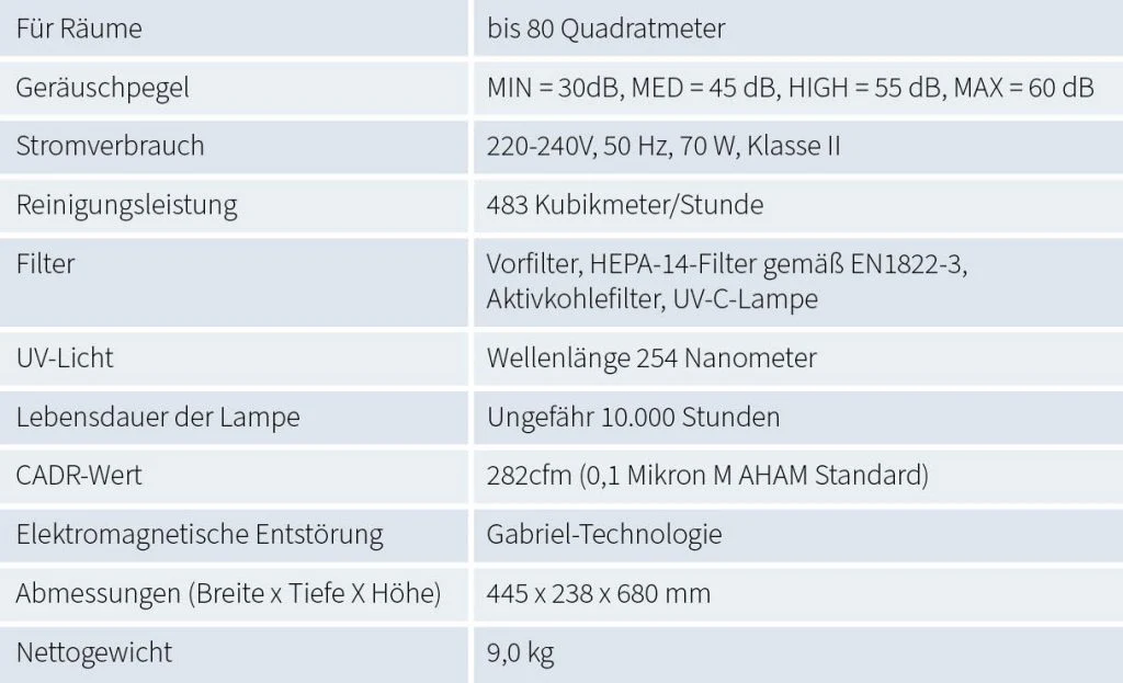 - Entfernt 99,99 % der Partikel wie Viren, pathogene Bakterien, Schimmelpilze, Aerosole und Feinstaub aus der Luft